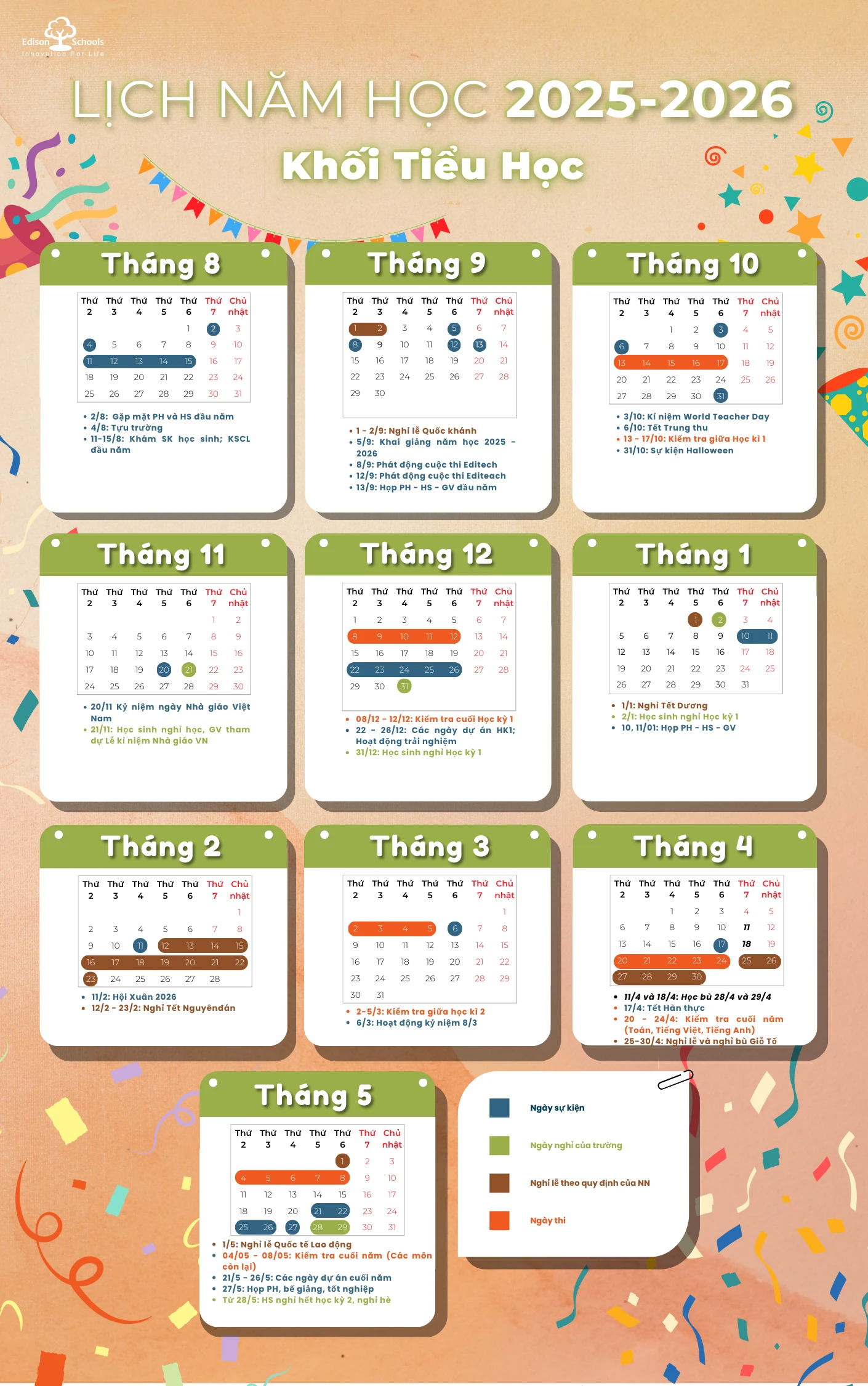 Trường PTLC EDISON xin gửi Quý Phụ huynh lịch năm học 2025 – 2026.