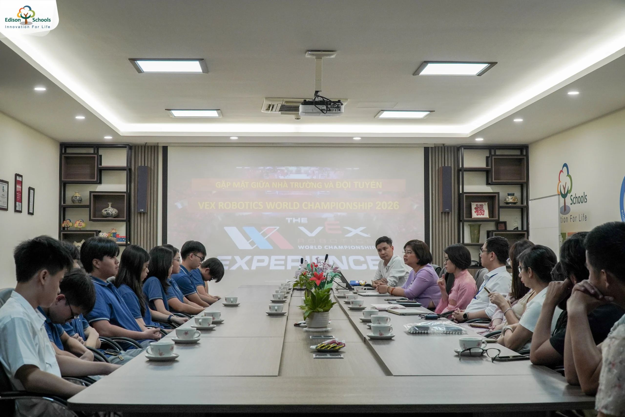 Vừa qua, Ban Giám hiệu Trường THCS và Ban Giám hiệu Trường THPT Edison Ecopark đã có buổi gặp gỡ, động viên hai đội tuyển Robotics EDS_BUNREAL và EDS_PHOMIABLE cùng các bậc phụ huynh trước thềm tham dự VEX Robotics World Championship 2026 tại Hoa Kỳ.