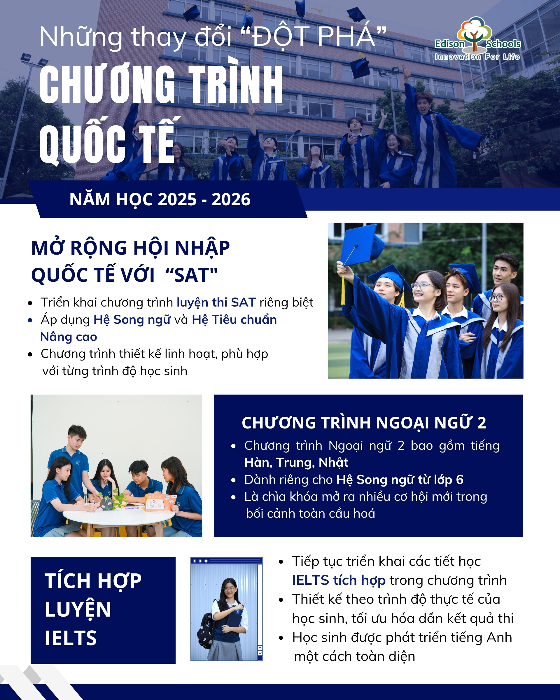 Trong năm học 2025 – 2026, Edison Schools chính thức điều chỉnh cấu phần Chương trình Quốc tế nhằm tăng cường khả năng hội nhập toàn cầu của học sinh trong bối cảnh quốc tế hóa diễn ra mạnh mẽ. Những điều chỉnh này tập trung vào việc đổi mới phương pháp học ngoại ngữ,. . .