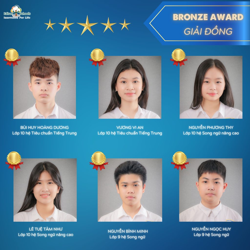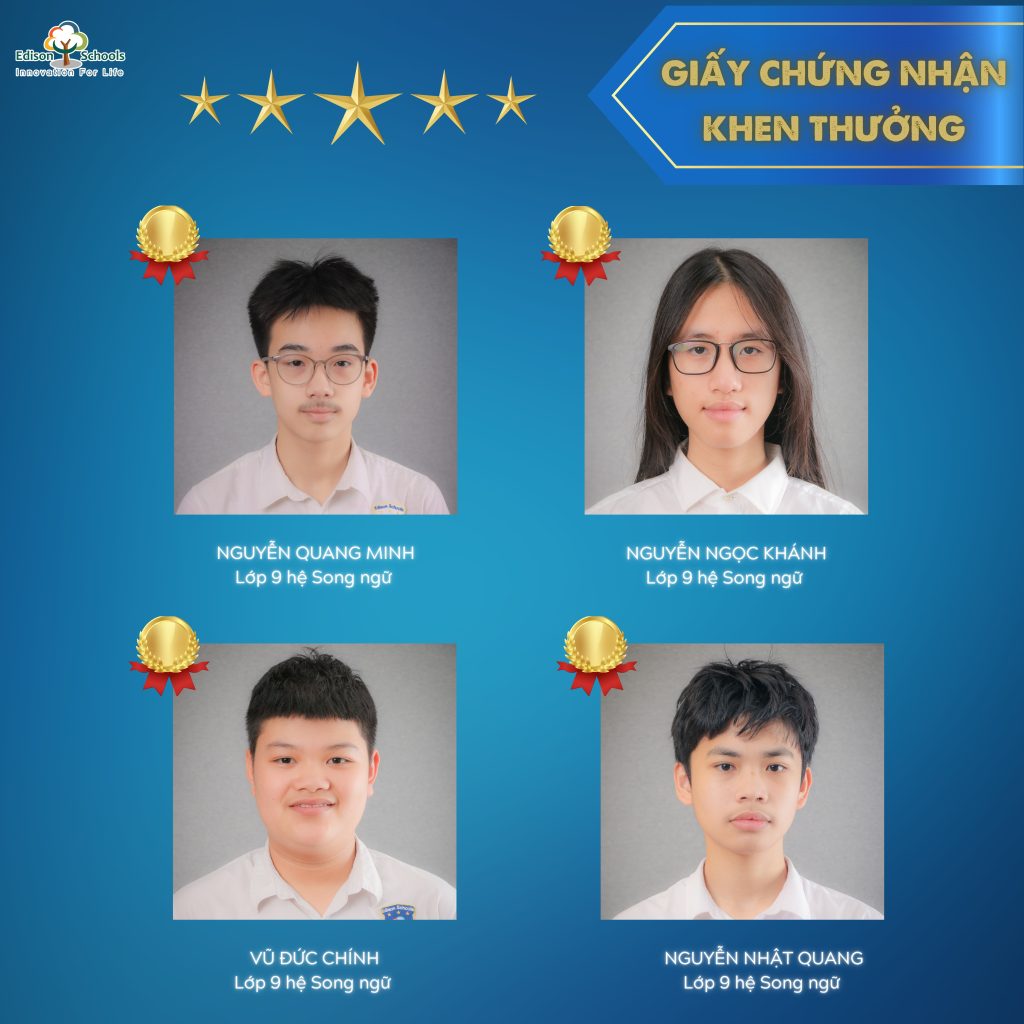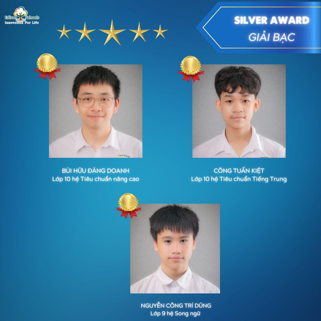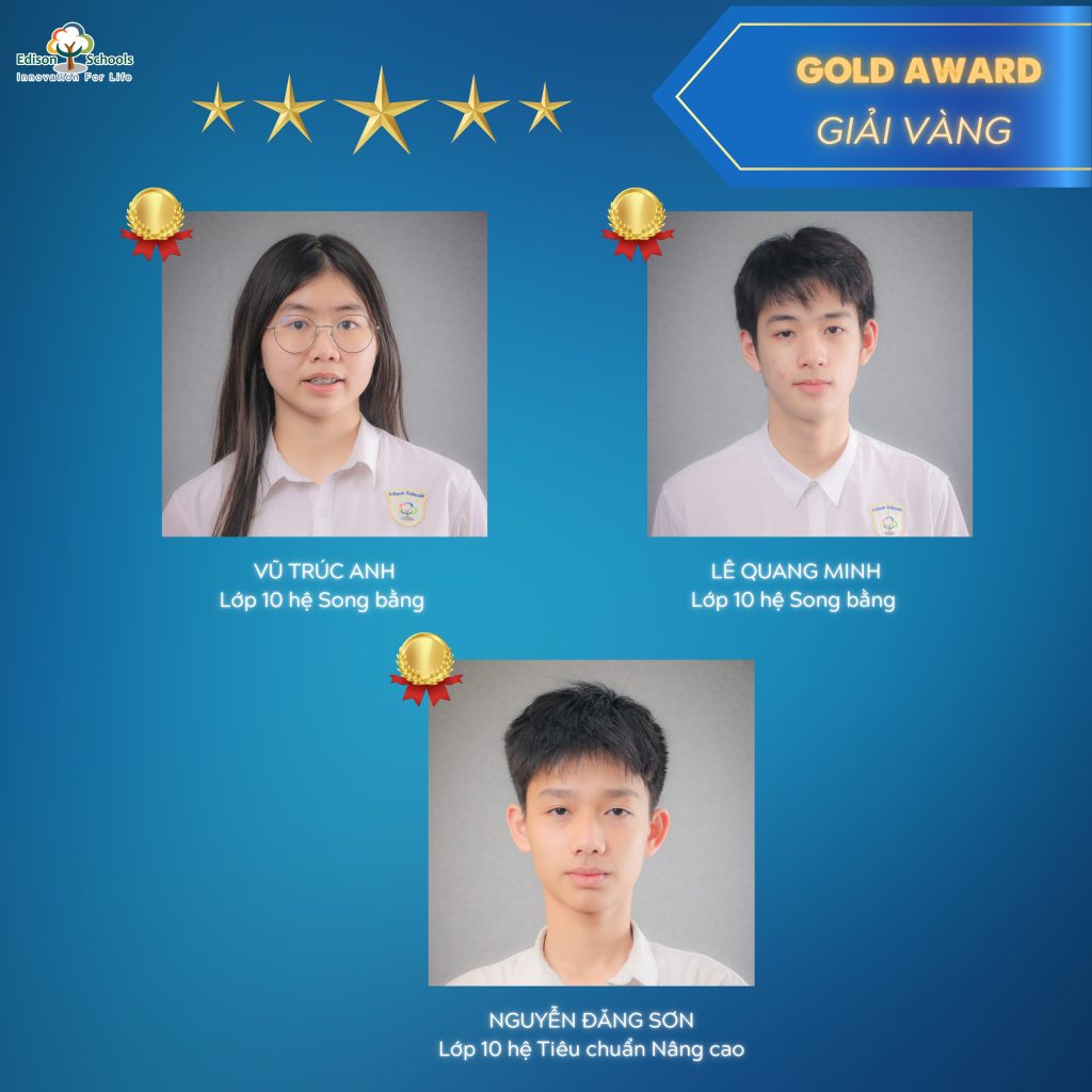 Cả 3 bạn đạt Huy chương Vàng đều xuất sắc góp mặt trong TOP 30 thí sinh có điểm số cao nhất tại BẢNG THI QUỐC TẾ – một cột mốc đáng tự hào khẳng định tài năng và bản lĩnh của học sinh Edison trên sân chơi quốc tế.