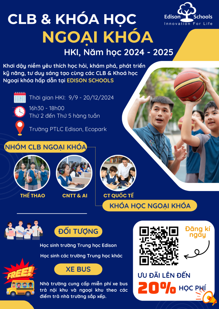 Khơi dậy niềm yêu thích học hỏi, khám phá, phát triển kỹ năng, tư duy sáng tạo cùng các CLB & Khoá học Ngoại khóa hấp dẫn tại Edison Schools dành cho học sinh trog và ngoài trường.