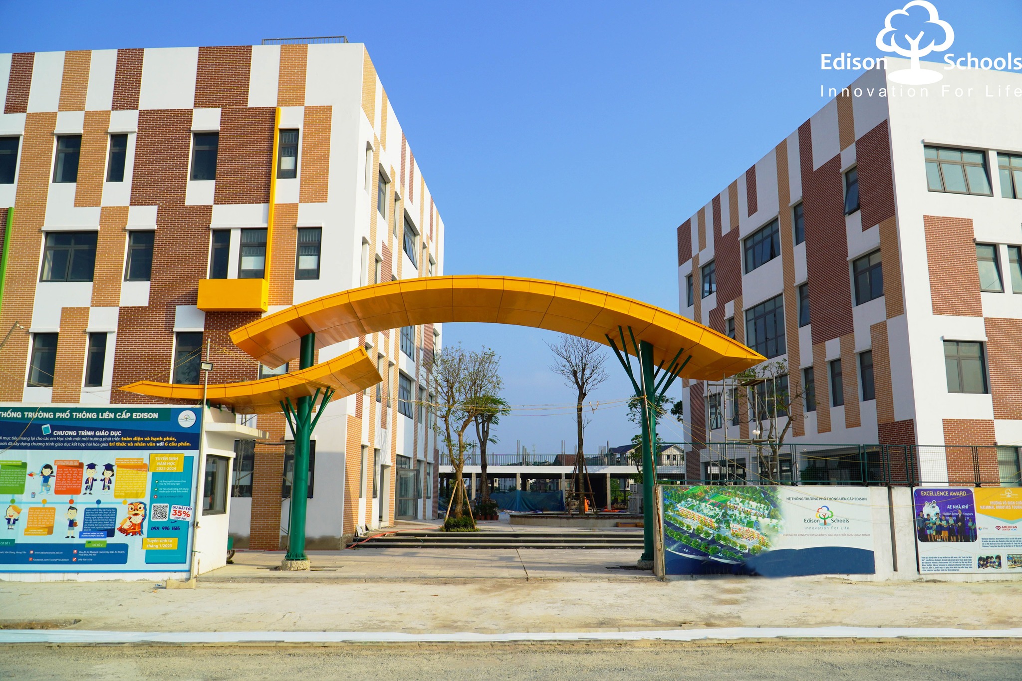 Cổng trường Edison An Khánh sắc vàng như rực rỡ hơn. Một bạn nhỏ khi đến trải nghiệm tại đây đã nhìn ra hình ảnh cổng trường như một cái cây thật to đang toả bóng để chở che cho tán cây nhỏ. Bạn ý nói rằng “Con nhìn ngay đây chính là cái cây”.
