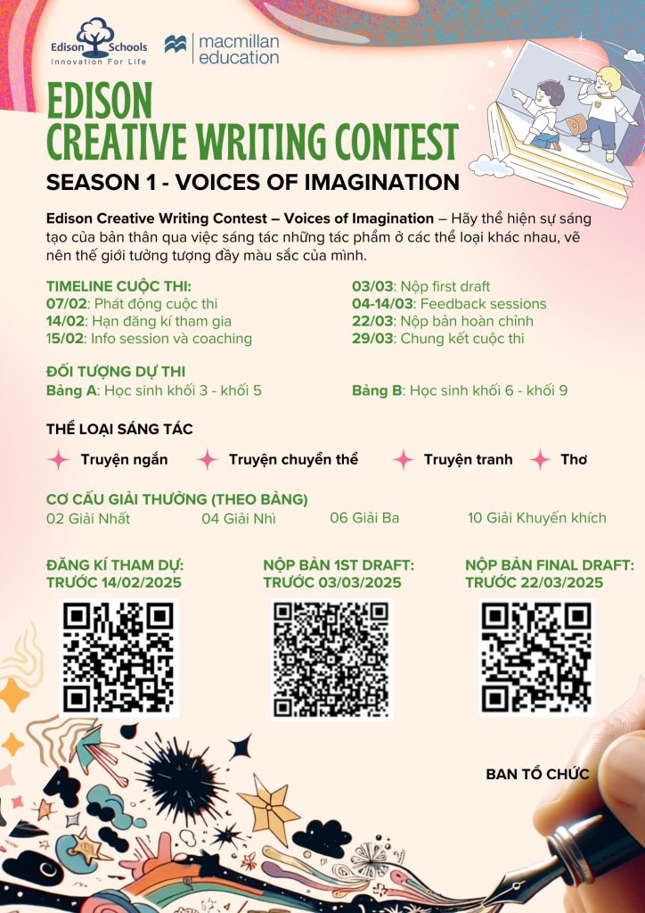 Nhằm khơi dậy niềm đam mê viết lách, phát triển khả năng sáng tạo và truyền cảm hứng cho học sinh, Hệ thống Trường PTLC Edison phối hợp cùng Nhà xuất bản Macmillan tổ chức Edison Creative Writing Contest – Voices of Imagination. Cuộc thi hứa hẹn sẽ là một sân chơi bổ ích, nơi các bạn học sinh được tự do thể hiện cá tính, chia sẻ câu chuyện của riêng mình và tỏa sáng qua từng câu chữ.