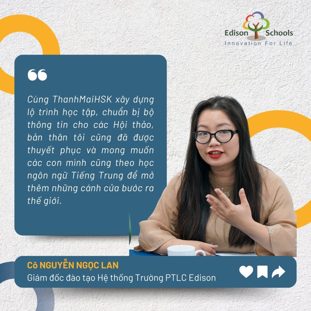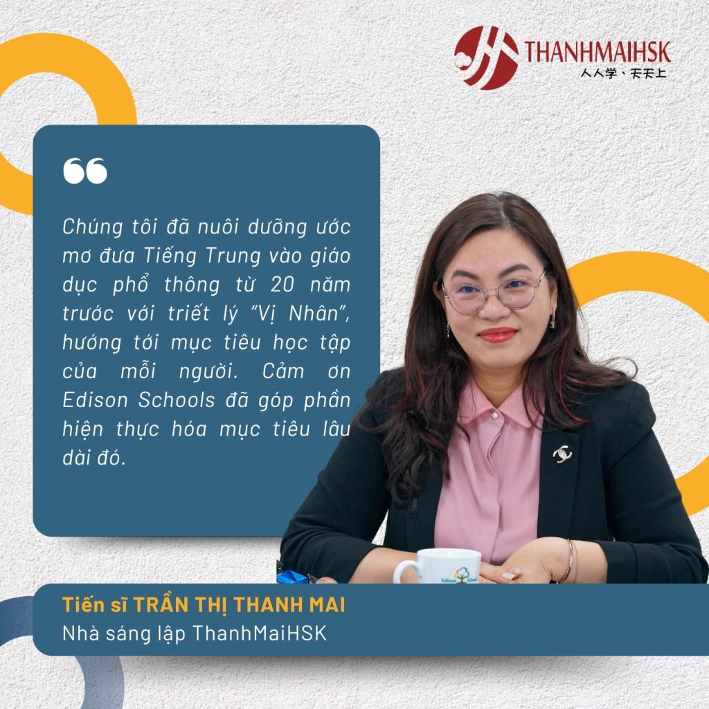 “Là Hệ thống trường phổ thông tư thục đầu tiên đưa chương trình Tiếng Trung như ngoại ngữ thứ nhất vào giảng dạy, chúng tôi rất chia sẻ những khó khăn và tinh thần tiên phong mà ThanhMaiHSK đã bắt đầu từ 20 năm trước. Chúng tôi tin tưởng vào ThanhMaiHSK là một đối tác lâu dài để cùng gây dựng và phát triển Hệ đào tạo Tiếng Trung trên khắp các điểm trường của Hệ thống Edison Schools trong hiện tại và tương lai không xa” – Cô Lê Tuệ Minh – Chủ tịch Hội đồng Trường chia sẻ.