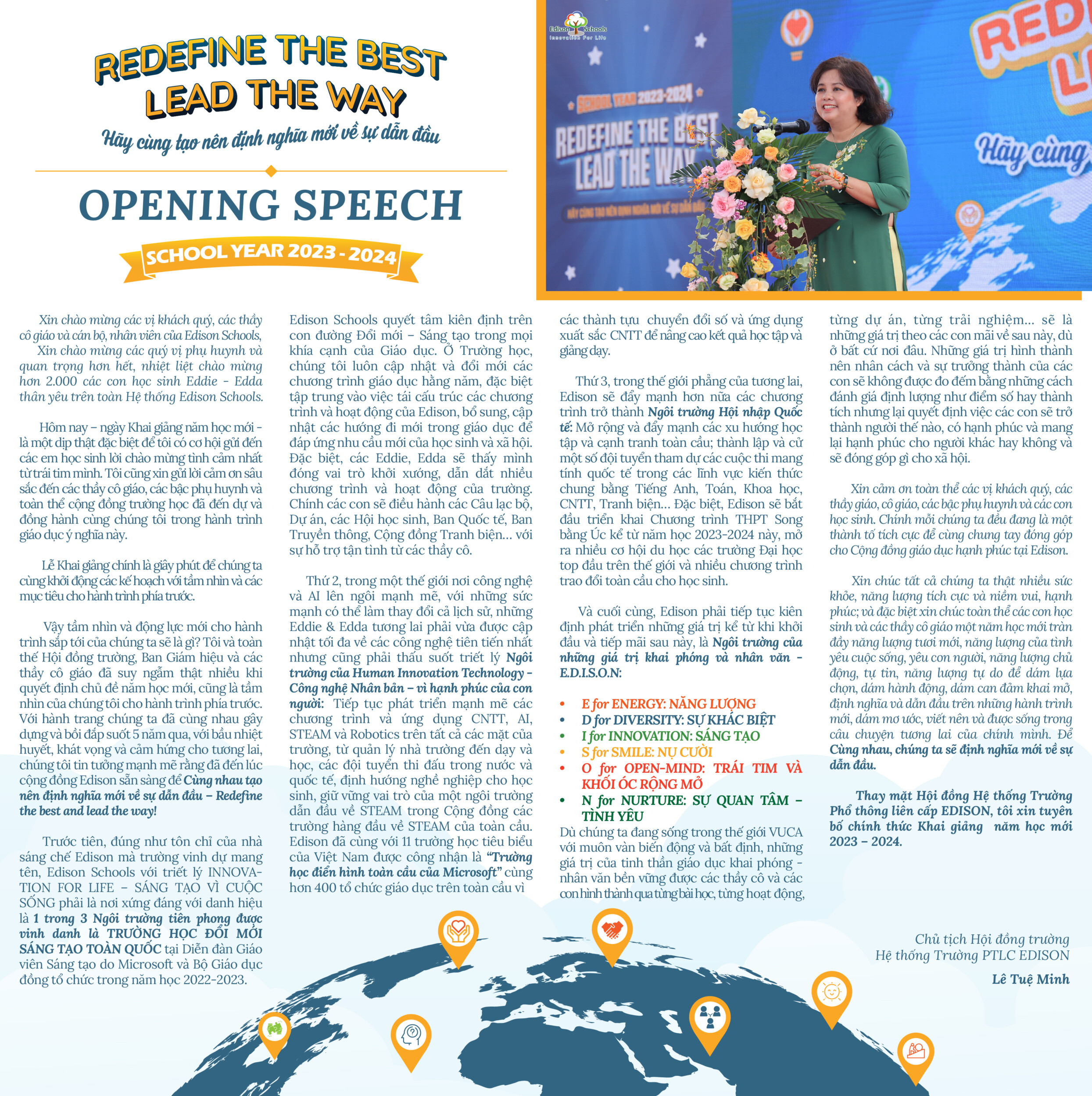 Edison Schools xin giới thiệu toàn văn bài phát biểu của cô Lê Tuệ Minh trong Lễ Khai giảng năm học 2023-2024. Một chặng đường còn rất dài ở phía trước, nhưng có niềm tin và có sự cộng hưởng của Nhà trường, Gia đình và Xã hội, chúng ta sẽ làm được!