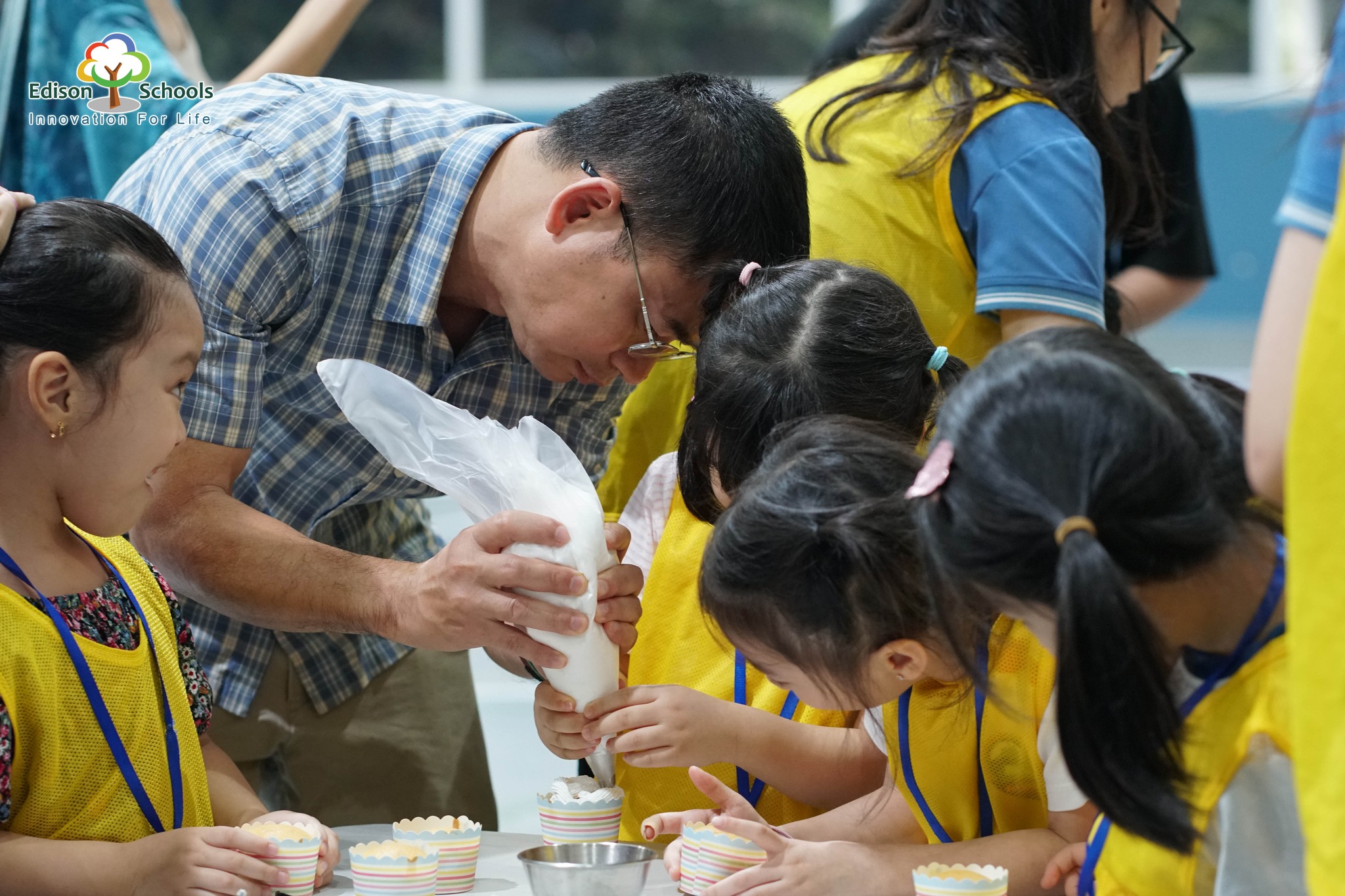 Cùng sự hướng dẫn của bố mẹ, con đã thể hiện được tinh thần làm việc nhóm, thỏa sức sáng tạo ra những chiếc bánh Cupcake thơm ngon và lôi cuốn.