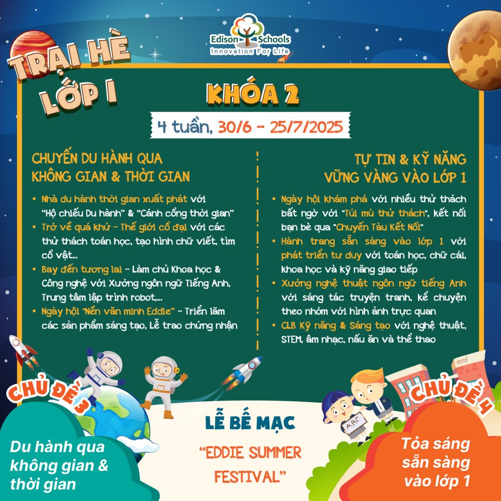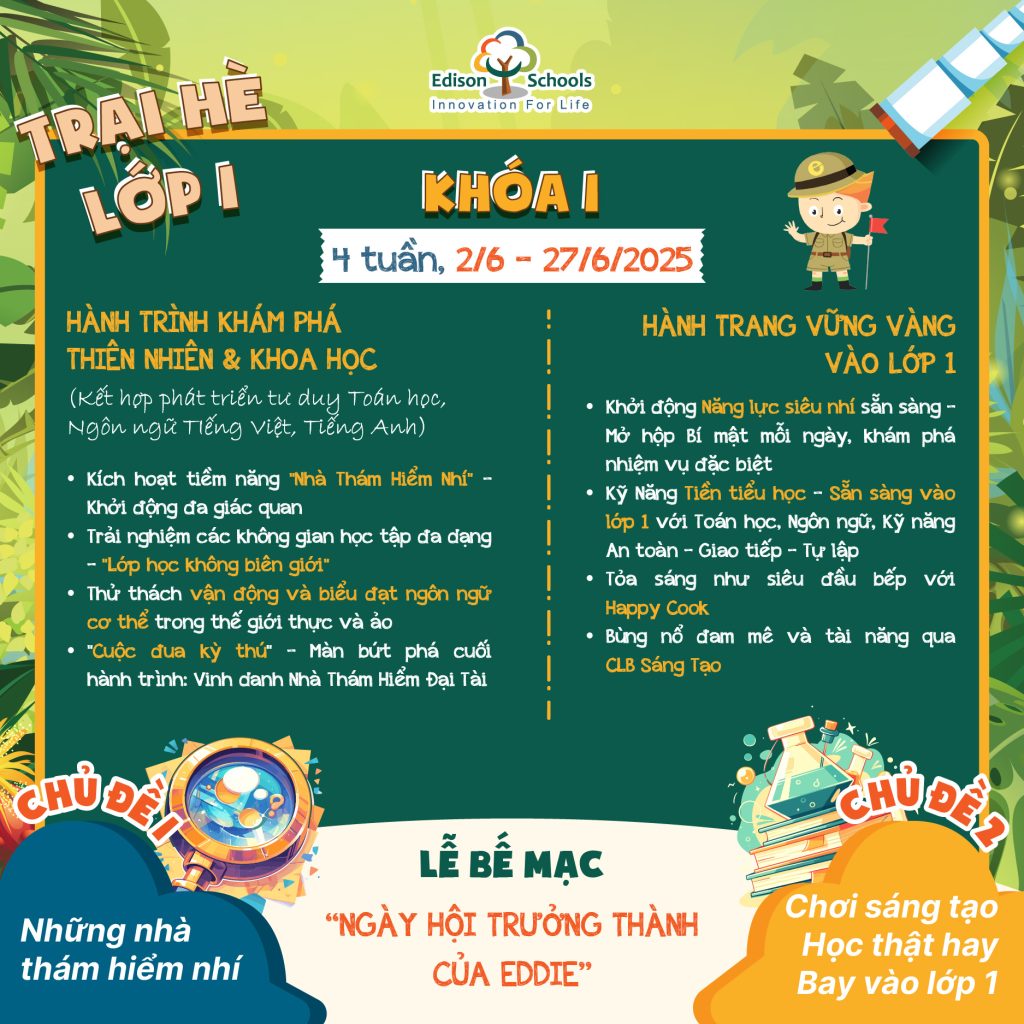 Để các con có sự chuẩn bị tốt nhất cho hành trình lớp 1, các thầy cô tại Edison Schools đặc biệt thiết kế Trại hè “Eddie Quest – Chiến binh sẵn sàng vào lớp 1” với nhiều hoạt động trải nghiệm đa dạng, hấp dẫn, giúp các con trang bị cả kiến thức và kỹ năng cần thiết với thông tin như sau:
