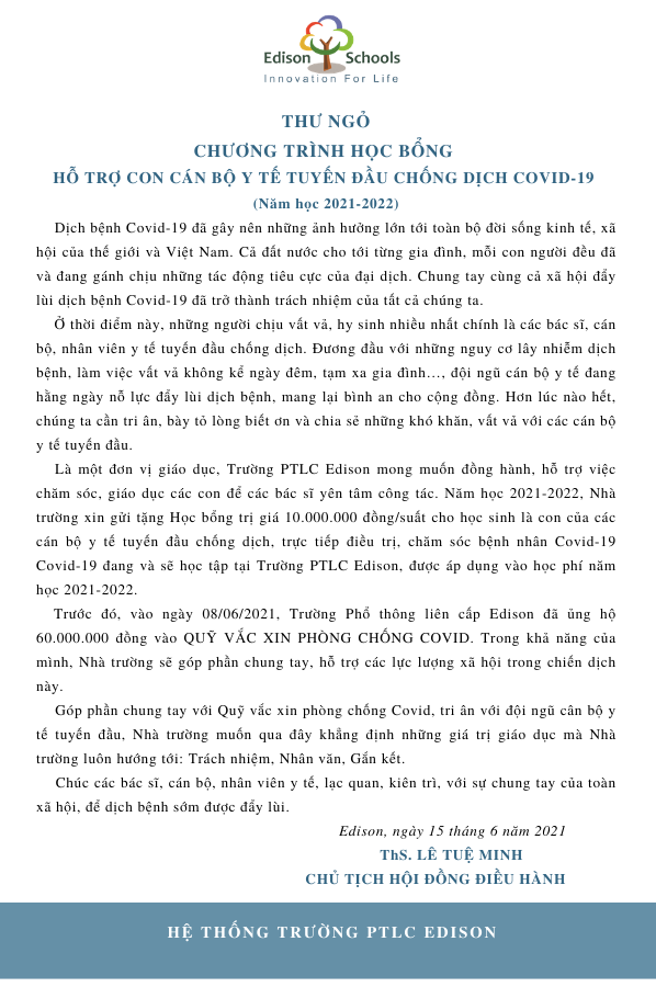 Năm học 2021-2022, Nhà trường xin gửi tặng Học bổng trị giá 10.000.000 đồng/suất cho học sinh là con của các cán bộ y tế tuyến đầu chống dịch, trực tiếp điều trị, chăm sóc bệnh nhân Covid-19, đang và sẽ học tập tại Trường PTLC Edison, được áp dụng vào học phí năm học 2021-2022.