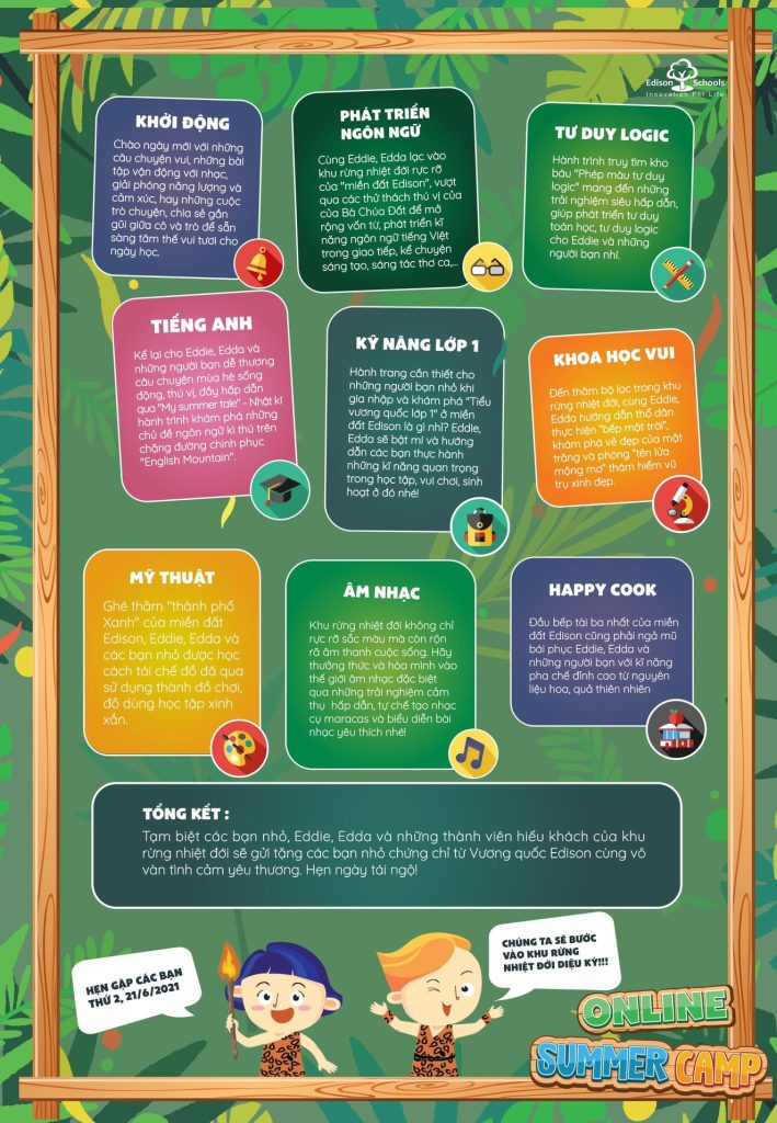 Các con sẽ được làm quen với Eddie và Edda – những người bạn mới ở Miền đất Edison trong 4 tuần của Trại hè thú vị này. Tại đây, các con sẽ cùng nhau khám phá Khu rừng nhiệt đới với muôn vàn trải nghiệm hấp dẫn cùng hai người bạn đáng yêu.