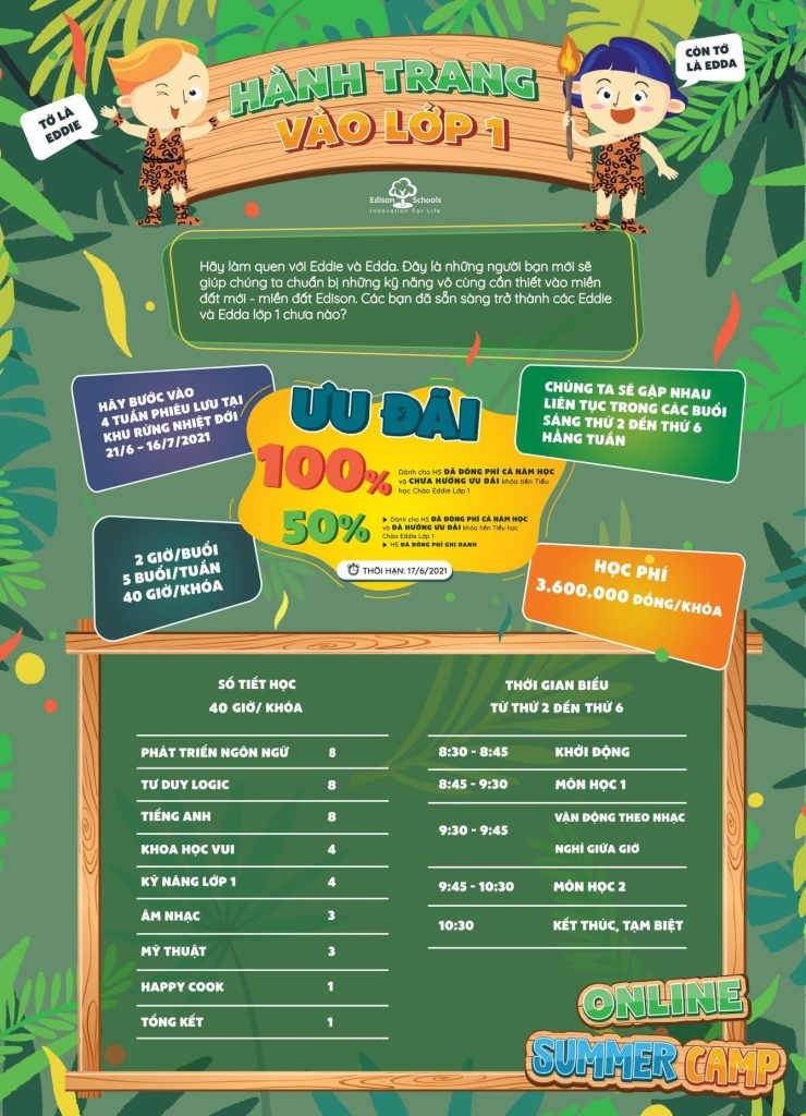 – Tặng 50% Học phí khóa học đối với các Phụ huynh & Học sinh đóng phí cả năm học trước 17/6/2021 và đã hưởng ưu đãi chương trình Tiền tiểu học “Chào Eddie Lớp 1”;