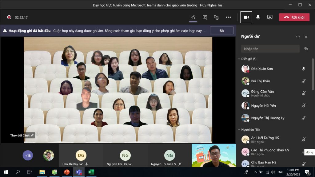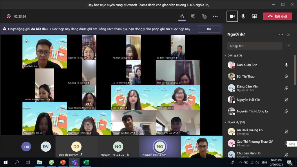 Ngày 18/02/2021: Bằng cầu nối là một giáo viên Toán trường THCS Nghĩa Trụ, Văn Giang, Hưng Yên, Cô Nguyễn Thị Hải – Hiệu trưởng Nhà trường điện thoại liên lạc tới Trường Edison với mong muốn có 1 buổi chia sẻ về dạy học trực tuyến cùng Microsoft Teams dành cho toàn bộ giáo viên nhà trường.