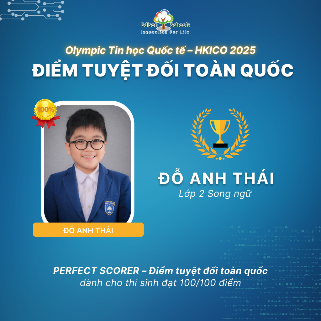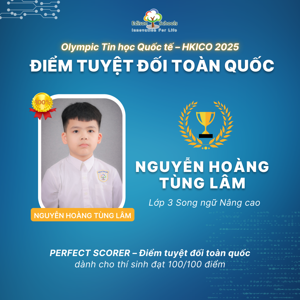 Trường Tiểu học Edison Ecopark chúc mừng 19 học sinh xuất sắc đã ghi dấu ấn mạnh mẽ tại Vòng Quốc gia – Kỳ thi Olympic Tin học Quốc tế HKICO 2025 với những thành tích ấn tượng và đáng tự hào.