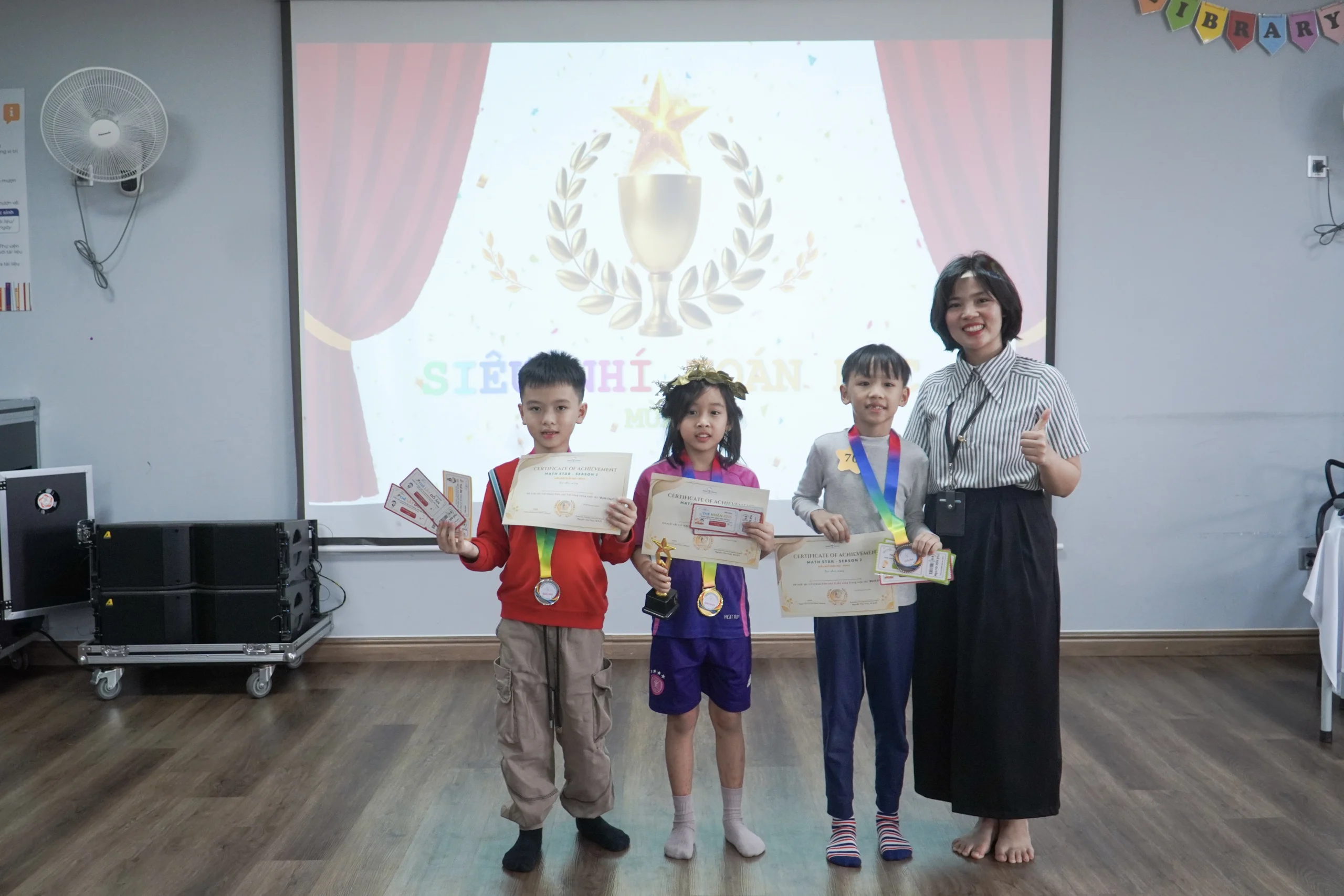 Những tràng vỗ tay liên tục vang lên khi các thí sinh đưa ra đáp án chính xác, thể hiện khả năng tư duy nhanh nhạy và phong thái tự tin. Sau những vòng tranh tài đầy gay cấn, các gương mặt xuất sắc nhất khối Tiểu học – những “ngôi sao toán học” của mùa giải năm nay đã chính thức lộ diện.