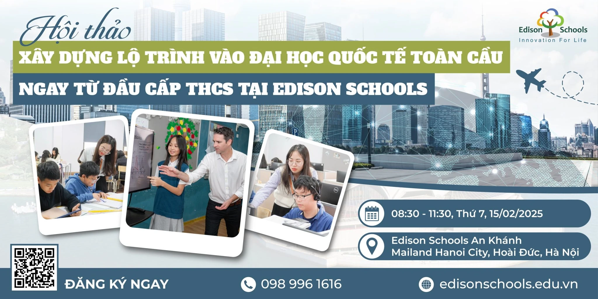 Thời gian: 08h30, ngày 15/02/2025 Địa điểm: Edison Schools An Khánh, KĐT Mailand Hà Nội City, Hoài Đức, Hà Nội Đăng ký ngay: https://bit.ly/HoithaoEdison25-26 Tại sao nên xây dựng mục tiêu Đại học quốc tế toàn cầu ngay từ đầu bậc Trung học cơ sở (THCS) ? Trường THCS Edison đang xây dựng lộ trình. . .