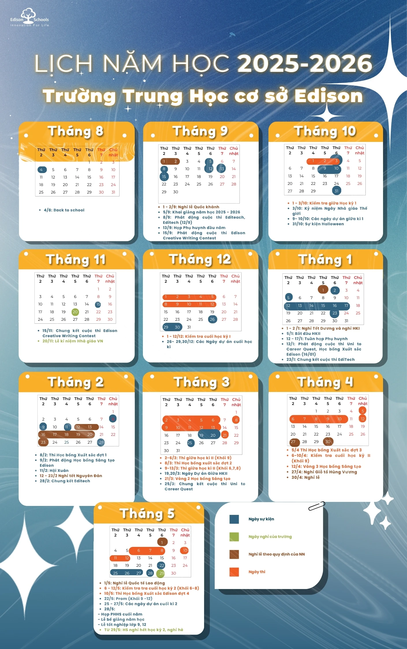 Trường PTLC EDISON xin gửi Quý Phụ huynh lịch năm học 2025 – 2026.