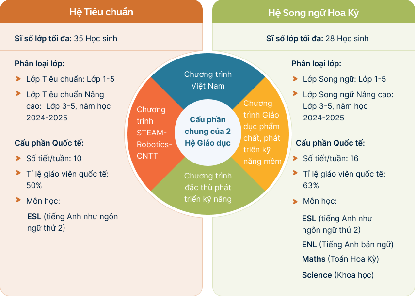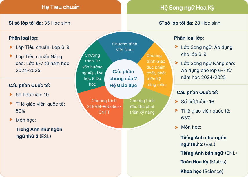 Hệ Song Ngữ: Sĩ số tối đa là 28 học sinh/lớp. Số tiết học tiếng Anh là 16 tiết/tuần với thời lượng 63% do giáo viên nước ngoài giảng dạy. Với Hệ Song ngữ, ngoài Chương trình ESL theo khung tham chiếu chuẩn ngôn ngữ châu Âu (CEFR), học sinh còn học Chương trình tiếng Anh bản ngữ (ENL), Toán Hoa Kỳ (Maths) và Tiếng Anh Khoa học (Science). Đây là những chương trình được xây dựng và phát triển trên nền tảng Khung chương trình phổ thông Hoa Kỳ (Common Core), hướng đến mục tiêu Học sinh đủ khả năng tiếng Anh và kiến thức học thuật để theo học các chương trình Đại học Quốc tế trong và ngoài nước.