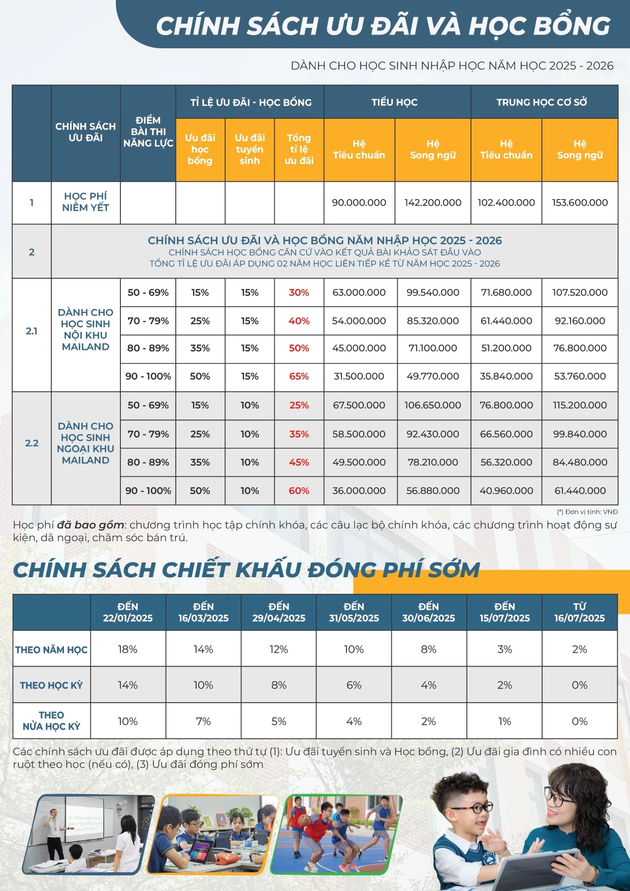 Chính sách ưu đãi cư dân Mailand trong 5 năm đầu kể từ khi thành lập trường (năm học 2023-2024) là 15%; trong 5 năm lần thứ 2 kể từ khi thành lập trường là 10%.
