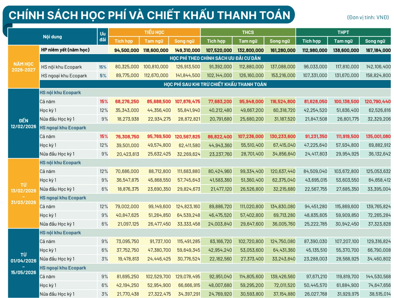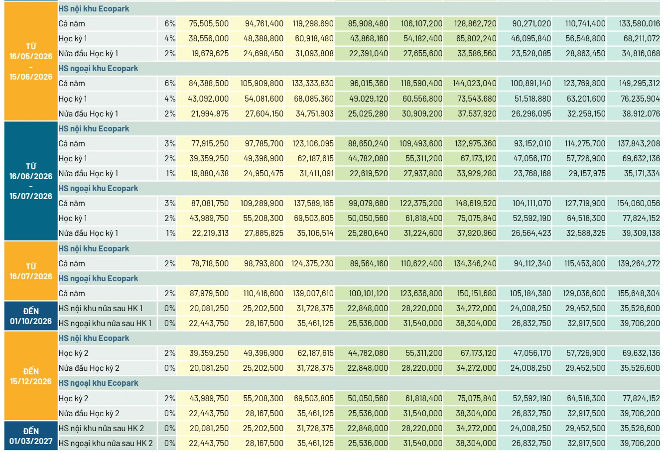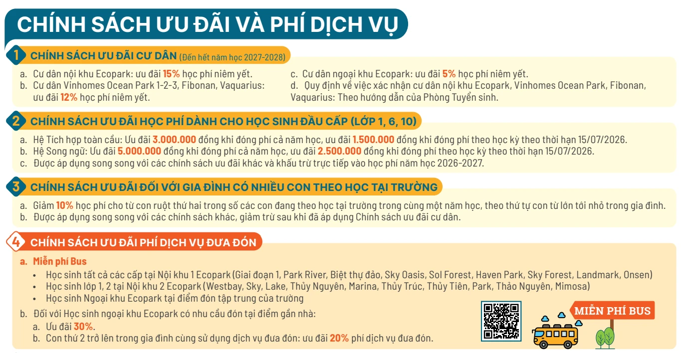Chính sách ưu đãi cư dân Ecopark trong 5 năm đầu kể từ khi thành lập trường là 20%; trong 5 năm thứ 2 kể từ khi thành lập trường là 15%