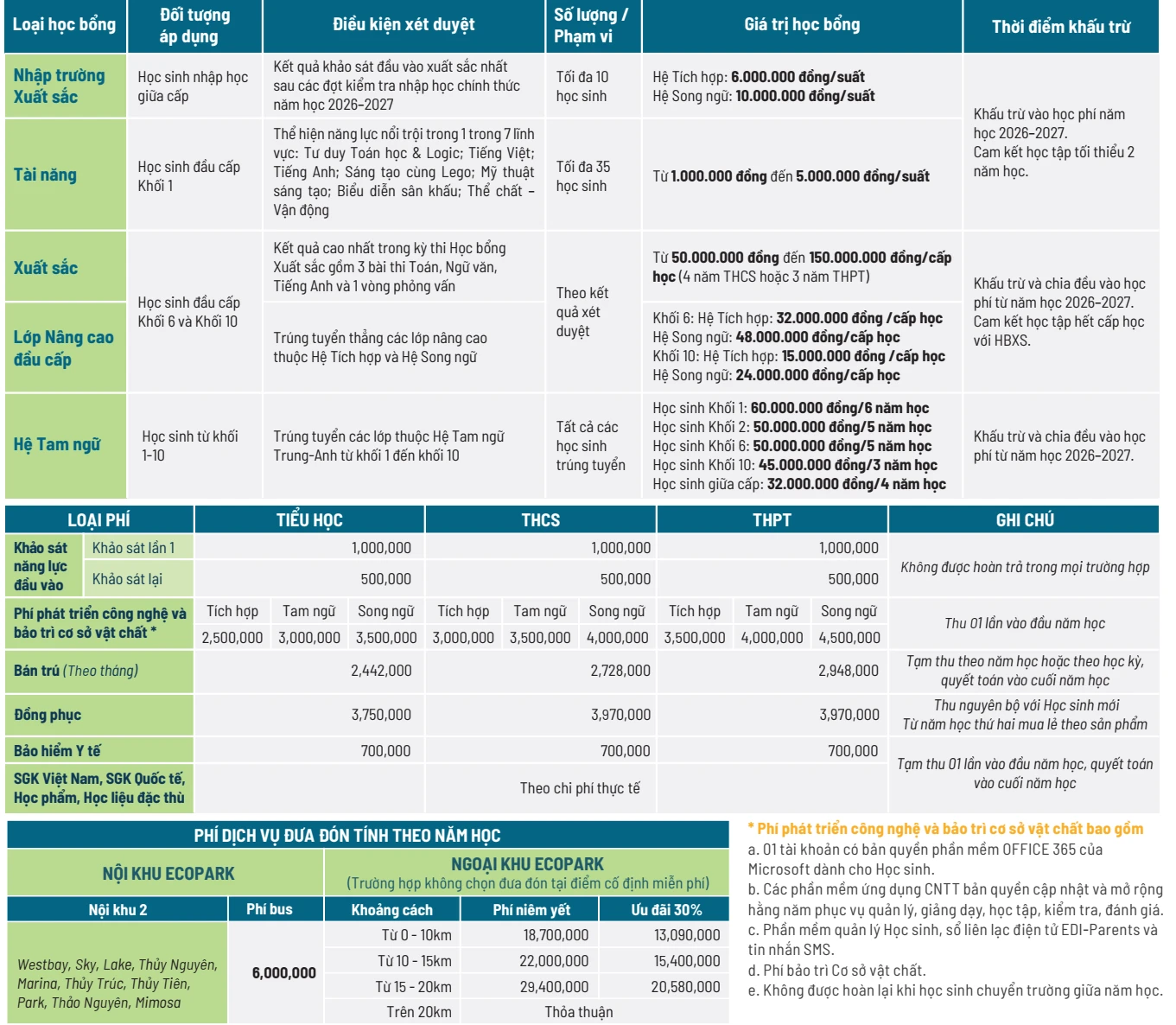 Toàn bộ các khoản phí cần đóng cho từng năm học đã được Nhà trường công bố minh bạch và rõ ràng tại phần Chính sách Học phí của Nhà trường; chi tiết tại LINK. Ngoài các khoản phí này, Nhà trường không thu thêm phí gì khác.